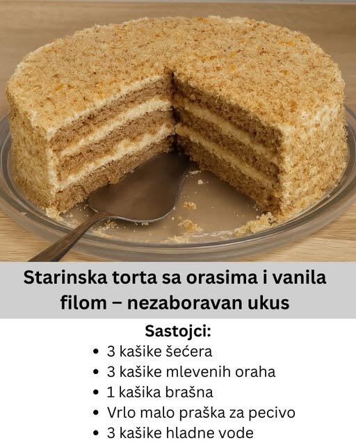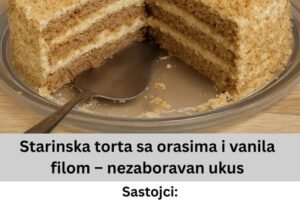 Ako volite domaće poslastice koje bude uspomene i miris na bakinu kuhinju, ova starinska torta sa orasima je pravi izbor. Sočne kore, bogat kremasti fil i mirisna narandžina kora čine je neodoljivom i savršenom za svaku svečanu priliku. Sastojci za kore: 3 jajeta 3 kašike šećera 3 kašike mlevenih oraha 1 kašika brašna Vrlo malo praška…