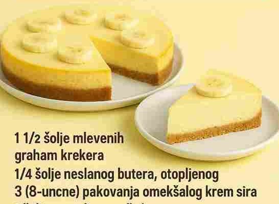 Sastojci:• 1 1/2 šolje mljevenih keksa (graham ili slični)• 1/4 šolje otopljenog maslaca• 3 pakovanja krem sira od 225 g (omekšanog)• 1 šolja kristal šećera• 3/4 šolje zgnječene banane (oko 2 banane)• 1 kašičica ekstrakta vanilije• 3 velika jaja Priprema: Zagrijte rernu na 160°C (325°F). Pomiješajte mljevene kekse s otopljenim maslacem dok se dobro ne…