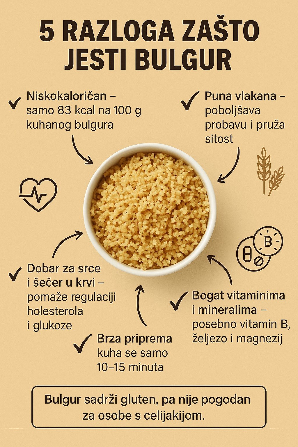 Bulgur je jednostavna, zdrava i ukusna namirnica koja donosi mnoge benefite organizmu. Iako sadrži gluten, njegova nutritivna vrijednost, bogatstvo vlakana i minerala čine ga odličnim izborom za sve koji žele poboljšati svoju ishranu. Brzo se kuha, lako uklapa u različita jela i pruža dugotrajan osjećaj sitosti.