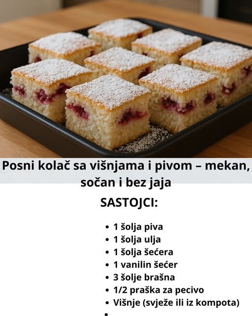 Ključne riječi: posni kolač, kolač sa višnjama, kolač bez jaja, kolač sa pivom, posna lenja pita, posni desert, recept za post.