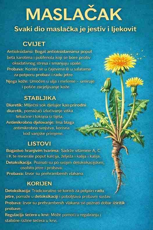 Maslačak pospješuje protok žuči iz otečene jetre, pomaže izlučivanje pjeska i kamenaca iz žučnog mjehura, poticanjem mokrenja odstranjuje iz tijela sve otrovne tvari i toksine.