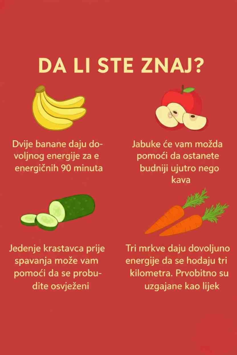 Mrkve – Tri mrkve daju dovoljno energije da prehodate tri kilometra! Osim što su odlične za vid, mrkve su se nekad uzgajale kao ljekovita biljka zbog bogatstva beta-karotena i antioksidanata.