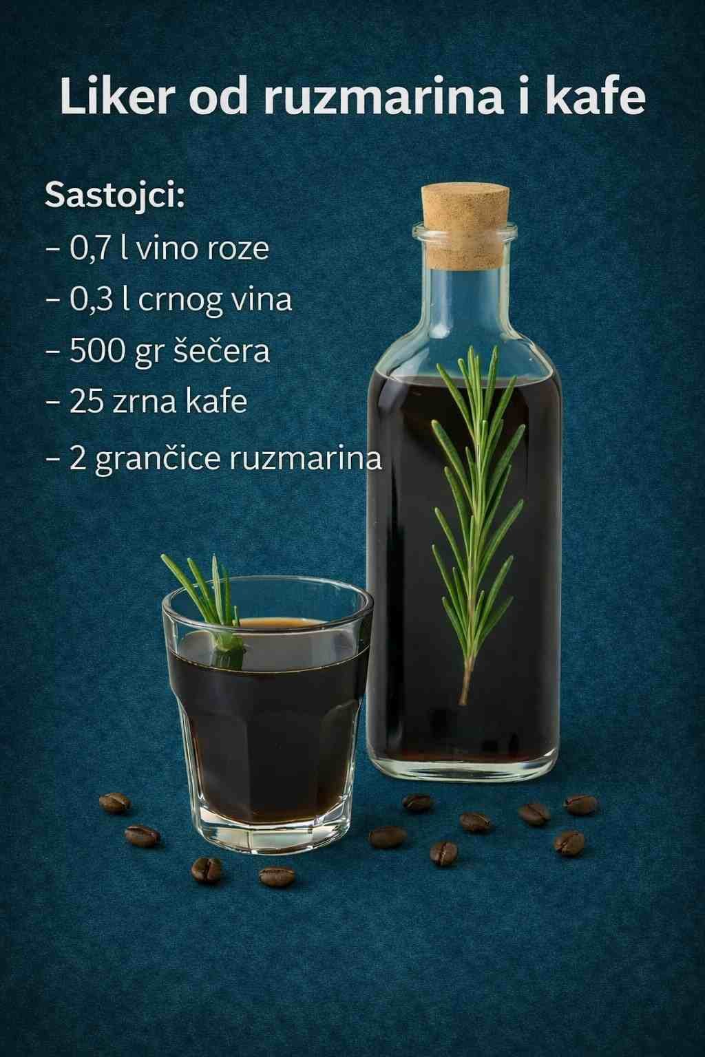 Ako ste ljubitelj domaćih likera i volite da otkrivate nove, neobične ukuse, ovaj liker od ruzmarina i kafe biće pravo malo čudo koje će vas oduševiti. Spoj aromatičnog ruzmarina, intenzivne, mirisne kafe i voćnog roze vina stvara izuzetno elegantno piće, savršeno za opuštanje tokom hladnih večeri ili kao originalan, ručno napravljen poklon za drage ljude.
